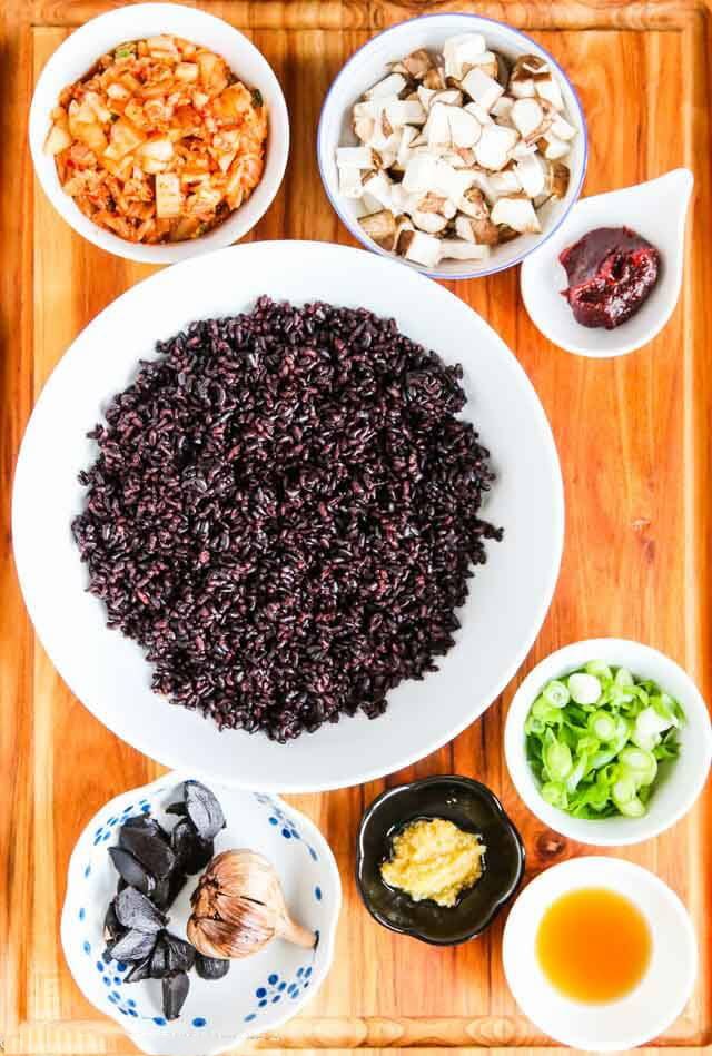 Nguyên liệu chuẩn bị món cơm rang kim chi tỏi đen.
